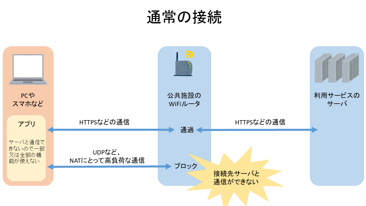 公共のWiFi回線はNATセッション数の節約などが目的で一部の通信をブロックしている場合があります。